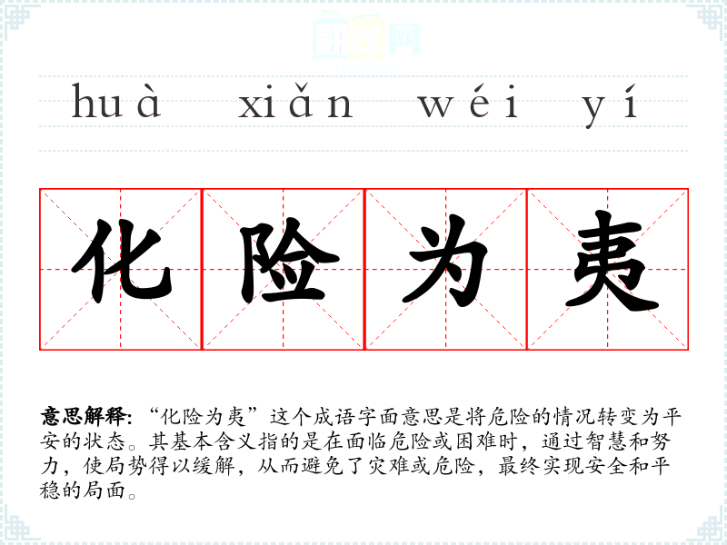 “化险为夷”这个成语字面意思是将危险的情况转变为平安的状态。其基本含义指的是在面临危险或困难时,通过智慧和努力,使局势得以缓解,从而避免了灾难或危险,最终实现安全和平稳的局面。