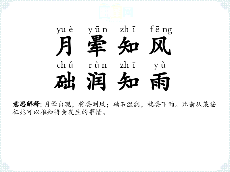 月晕出现,将要刮风;础石湿润,就要下雨。比喻从某些征兆可以推知将会发生的事情。 |