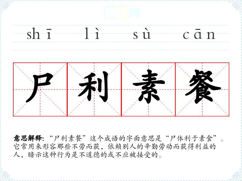 “尸利素餐”这个成语的字面意思是“尸体利于素食”。它常用来形容那些不劳而获,依赖别人的辛勤劳动而获得利益的人,暗示这种行为是不道德的或不应被接受的。
