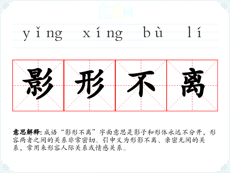 成语“影形不离”字面意思是影子和形体永远不分开,形容两者之间的关系非常密切。引申义为形影不离、亲密无间的关系,常用来形容人际关系或情感关系。