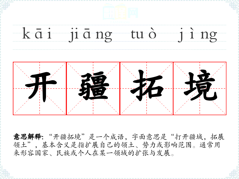 | 开疆拓境 | 开拓疆域,扩展领土。同“开疆拓土”。 |