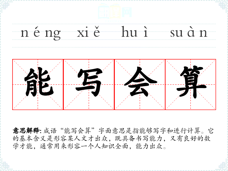 成语“能写会算”字面意思是指能够写字和进行计算。它的基本含义是形容某人文才出众,既具备书写能力,又有良好的数学才能,通常用来形容一个人知识全面,能力出众。