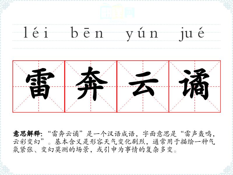 “雷奔云谲”是一个汉语成语,字面意思是“雷声轰鸣,云彩变幻”。基本含义是形容天气变化剧烈,通常用于描绘一种气氛紧张、变幻莫测的场景,或引申为事情的复杂多变。