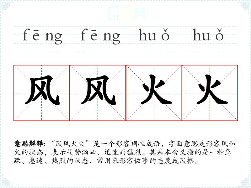 “风风火火”是一个形容词性成语,字面意思是形容风和火的状态,表示气势汹汹、迅速而猛烈。其基本含义指的是一种急躁、急速、热烈的状态,常用来形容做事的态度或风格。