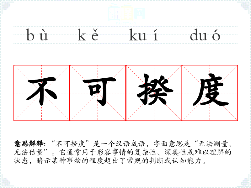 “不可揆度”是一个汉语成语,字面意思是“无法测量、无法估量”。它通常用于形容事情的复杂性、深奥性或难以理解的状态,暗示某种事物的程度超出了常规的判断或认知能力。