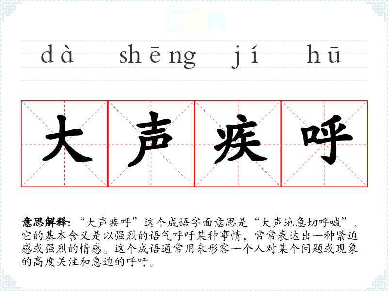 “大声疾呼”这个成语字面意思是“大声地急切呼喊”,它的基本含义是以强烈的语气呼吁某种事情,常常表达出一种紧迫感或强烈的情感。这个成语通常用来形容一个人对某个问题或现象的高度关注和急迫的呼吁。
