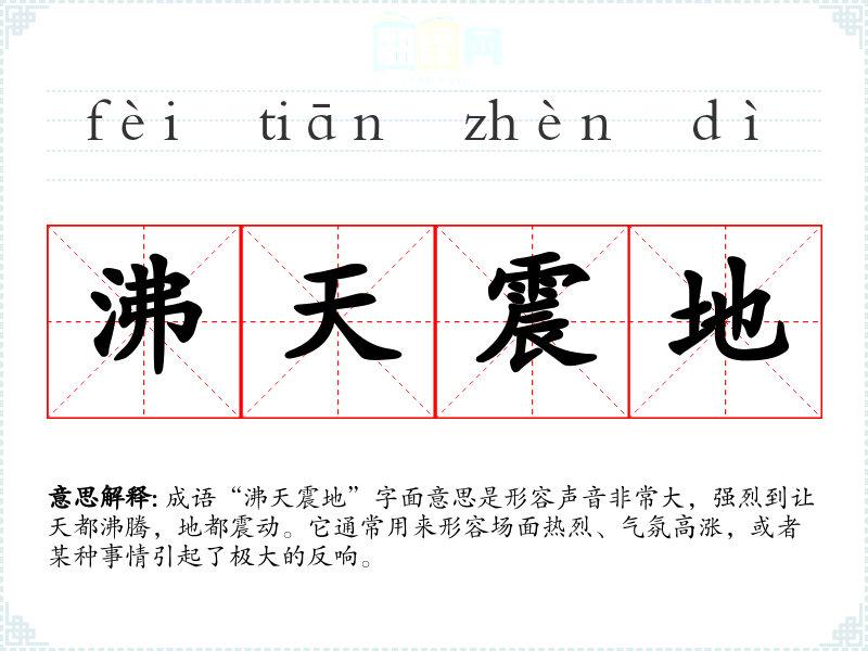 成语“沸天震地”字面意思是形容声音非常大,强烈到让天都沸腾,地都震动。它通常用来形容场面热烈、气氛高涨,或者某种事情引起了极大的反响。