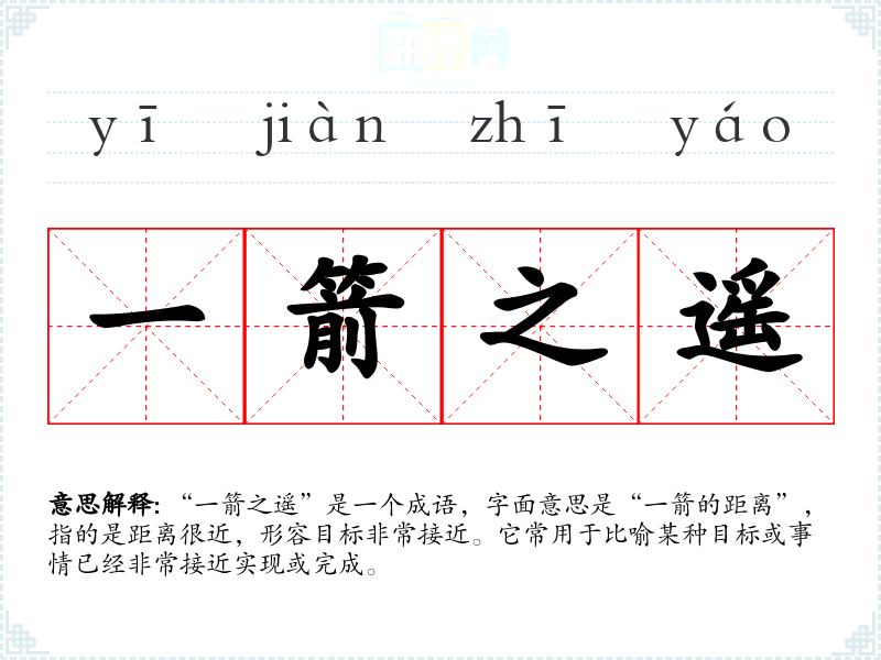 “一箭之遥”是一个成语,字面意思是“一箭的距离”,指的是距离很近,形容目标非常接近。它常用于比喻某种目标或事情已经非常接近实现或完成。