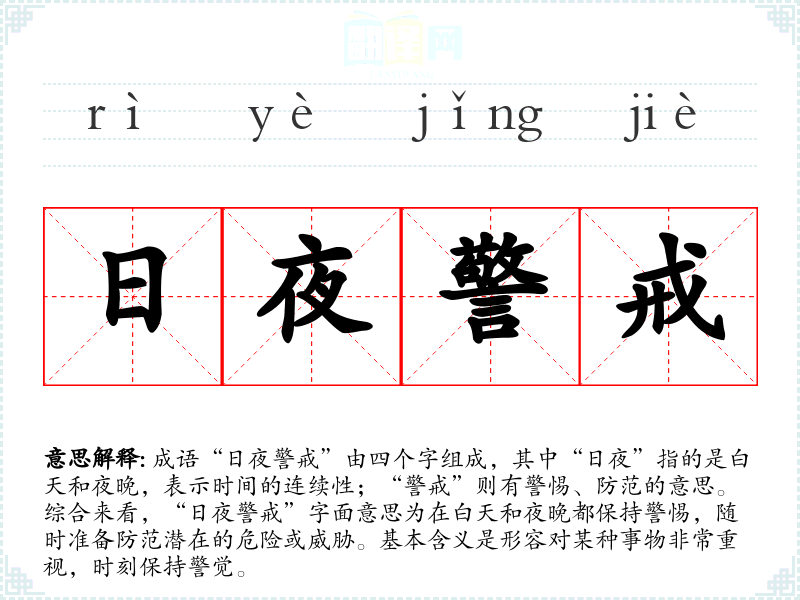 成语“日夜警戒”由四个字组成,其中“日夜”指的是白天和夜晚,表示时间的连续性;“警戒”则有警惕、防范的意思。综合来看,“日夜警戒”字面意思为在白天和夜晚都保持警惕,随时准备防范潜在的危险或威胁。基本含义是形容对某种事物非常重视,时刻保持警觉。