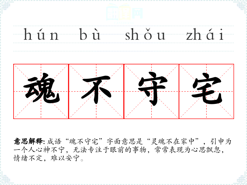 成语“魂不守宅”字面意思是“灵魂不在家中”,引申为一个人心神不宁,无法专注于眼前的事物,常常表现为心思飘忽,情绪不定,难以安宁。