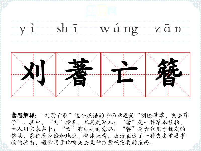 “刈蓍亡簪”这个成语的字面意思是“割除蓍草,失去簪子”。其中,“刈”指割,尤其是草木;“蓍”是一种草本植物,古人用它来占卜;“亡”有失去的意思;“簪”是古代用于插发的饰物,象征着身份和地位。整体来看,成语表达了一种失去重要事物的状态,通常用于比喻失去某种依靠或重要的东西。