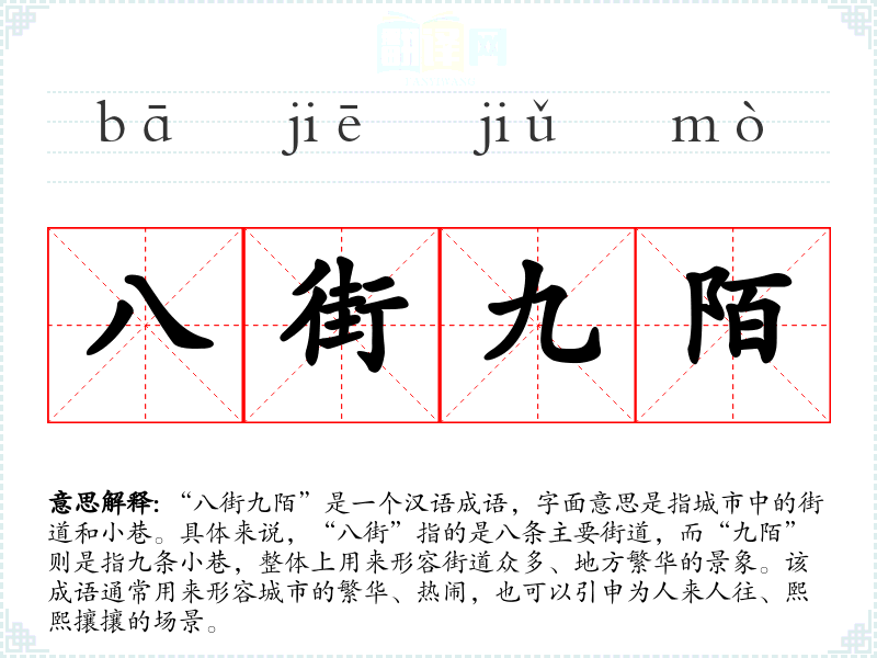 “八街九陌”是一个汉语成语,字面意思是指城市中的街道和小巷。具体来说,“八街”指的是八条主要街道,而“九陌”则是指九条小巷,整体上用来形容街道众多、地方繁华的景象。该成语通常用来形容城市的繁华、热闹,也可以引申为人来人往、熙熙攘攘的场景。