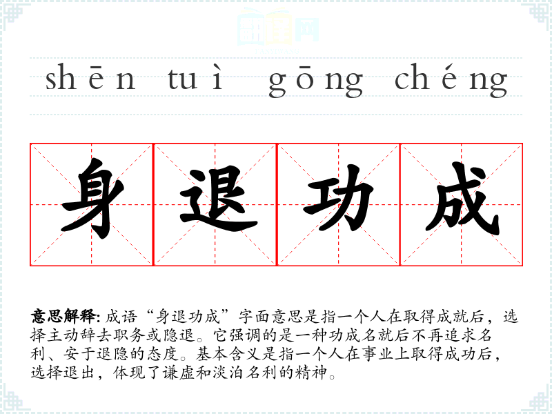 成语“身退功成”字面意思是指一个人在取得成就后,选择主动辞去职务或隐退。它强调的是一种功成名就后不再追求名利、安于退隐的态度。基本含义是指一个人在事业上取得成功后,选择退出,体现了谦虚和淡泊名利的精神。