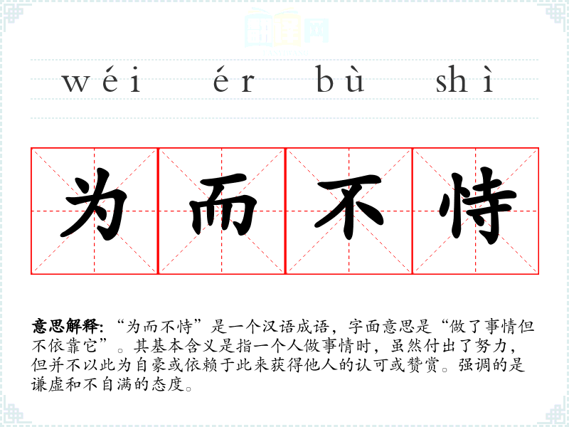 “为而不恃”是一个汉语成语,字面意思是“做了事情但不依靠它”。其基本含义是指一个人做事情时,虽然付出了努力,但并不以此为自豪或依赖于此来获得他人的认可或赞赏。强调的是谦虚和不自满的态度。