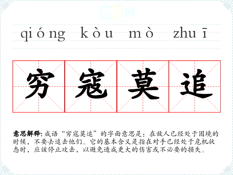 成语“穷寇莫追”的字面意思是:在敌人已经处于困境的时候,不要去追击他们。它的基本含义是指在对手已经处于危机状态时,应该停止攻击,以避免造成更大的伤害或不必要的损失。