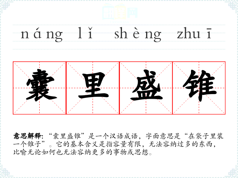 “囊里盛锥”是一个汉语成语,字面意思是“在袋子里装一个锥子”。它的基本含义是指容量有限,无法容纳过多的东西,比喻无论如何也无法容纳更多的事物或思想。