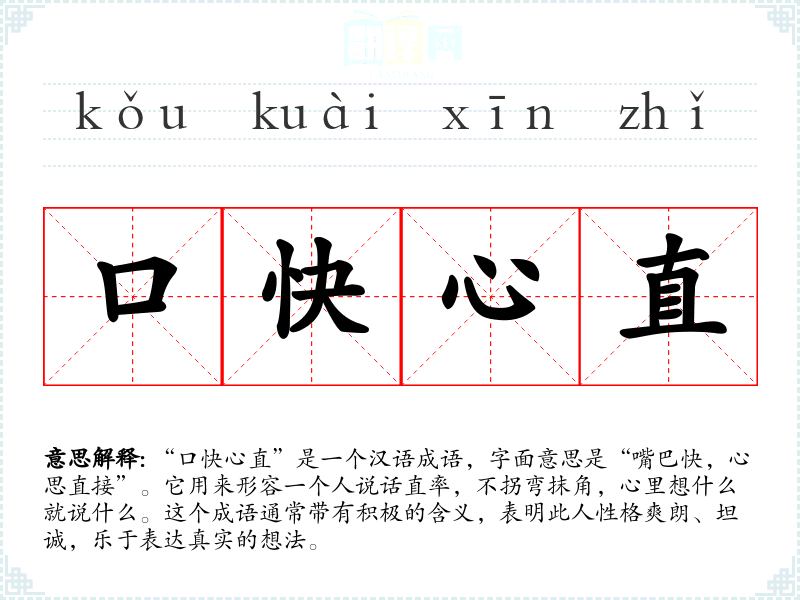 “口快心直”是一个汉语成语,字面意思是“嘴巴快,心思直接”。它用来形容一个人说话直率,不拐弯抹角,心里想什么就说什么。这个成语通常带有积极的含义,表明此人性格爽朗、坦诚,乐于表达真实的想法。