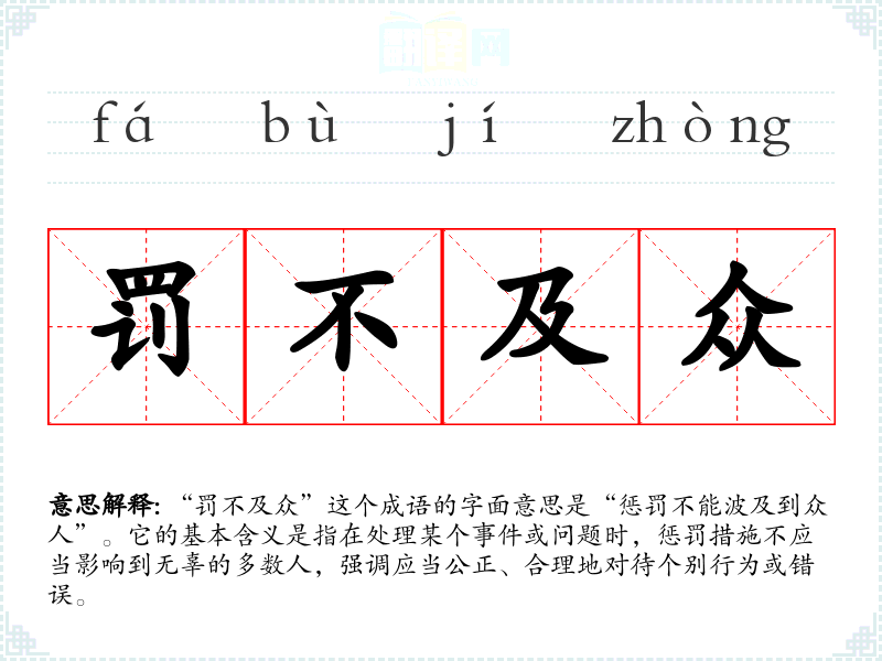 | 罚不责众 | 罚:惩罚;责:责罚;众:多数人。指某种行为即使应片惩罚,但很多人都那样干,也就不好采取惩罚的办法去处理了。 |