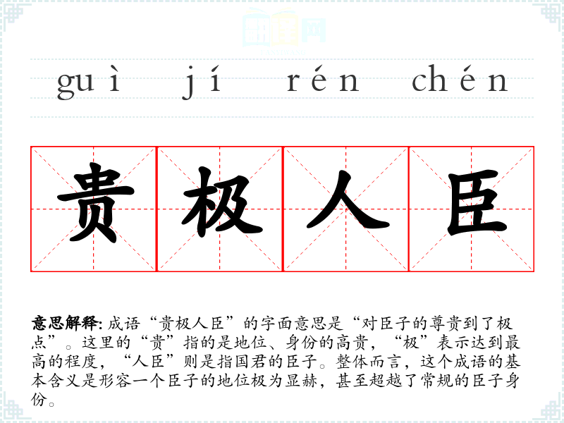 成语“贵极人臣”的字面意思是“对臣子的尊贵到了极点”。这里的“贵”指的是地位、身份的高贵,“极”表示达到最高的程度,“人臣”则是指国君的臣子。整体而言,这个成语的基本含义是形容一个臣子的地位极为显赫,甚至超越了常规的臣子身份。