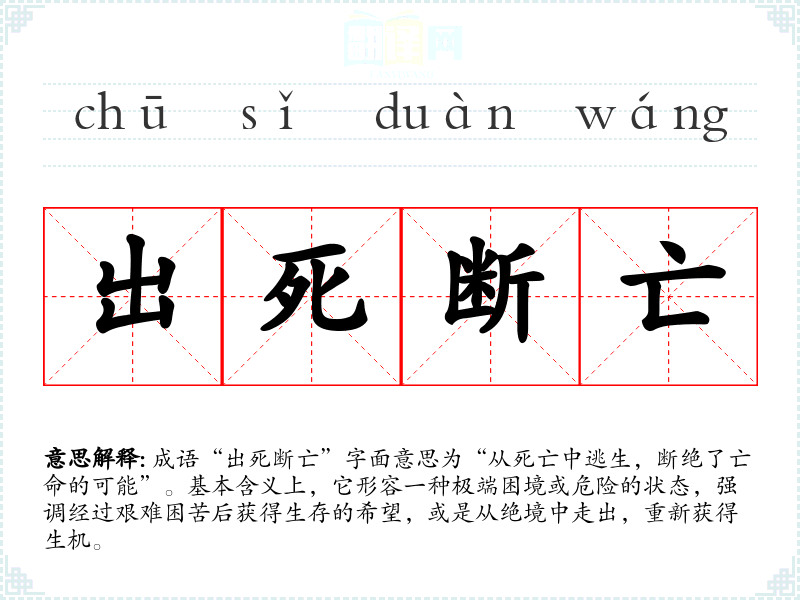 成语“出死断亡”字面意思为“从死亡中逃生,断绝了亡命的可能”。基本含义上,它形容一种极端困境或危险的状态,强调经过艰难困苦后获得生存的希望,或是从绝境中走出,重新获得生机。