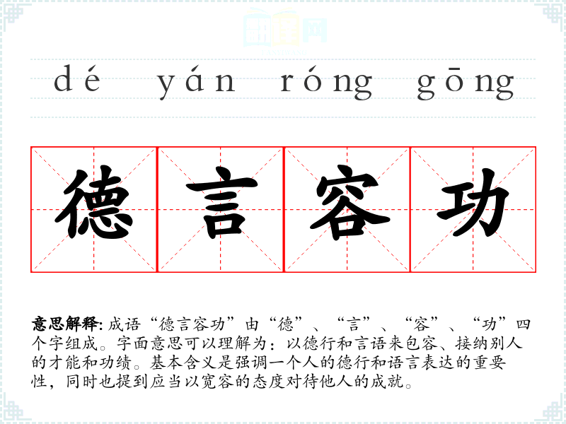 成语“德言容功”由“德”、“言”、“容”、“功”四个字组成。字面意思可以理解为:以德行和言语来包容、接纳别人的才能和功绩。基本含义是强调一个人的德行和语言表达的重要性,同时也提到应当以宽容的态度对待他人的成就。