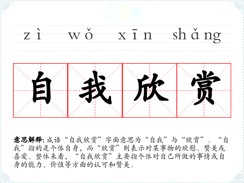 成语“自我欣赏”字面意思为“自我”与“欣赏”。“自我”指的是个体自身,而“欣赏”则表示对某事物的欣慰、赞美或喜爱。整体来看,“自我欣赏”主要指个体对自己所做的事情或自身的能力、价值等方面的认可和赞美。