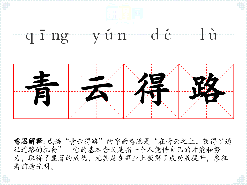 成语“青云得路”的字面意思是“在青云之上,获得了通往道路的机会”。它的基本含义是指一个人凭借自己的才能和努力,取得了显著的成就,尤其是在事业上获得了成功或提升,象征着前途光明。