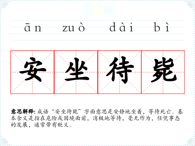 成语“安坐待毙”字面意思是安静地坐着,等待死亡。基本含义是指在危险或困境面前,消极地等待,毫无作为,任凭事态的发展,通常带有贬义。