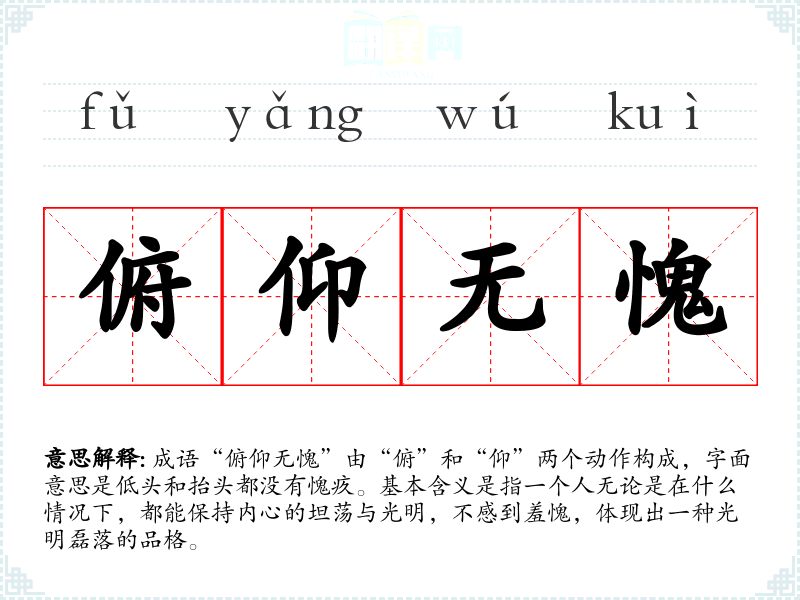 成语“俯仰无愧”由“俯”和“仰”两个动作构成,字面意思是低头和抬头都没有愧疚。基本含义是指一个人无论是在什么情况下,都能保持内心的坦荡与光明,不感到羞愧,体现出一种光明磊落的品格。