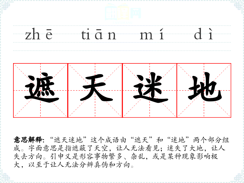 “遮天迷地”这个成语由“遮天”和“迷地”两个部分组成。字面意思是指遮蔽了天空,让人无法看见;迷失了大地,让人失去方向。引申义是形容事物繁多、杂乱,或是某种现象影响极大,以至于让人无法分辨真伪和方向。