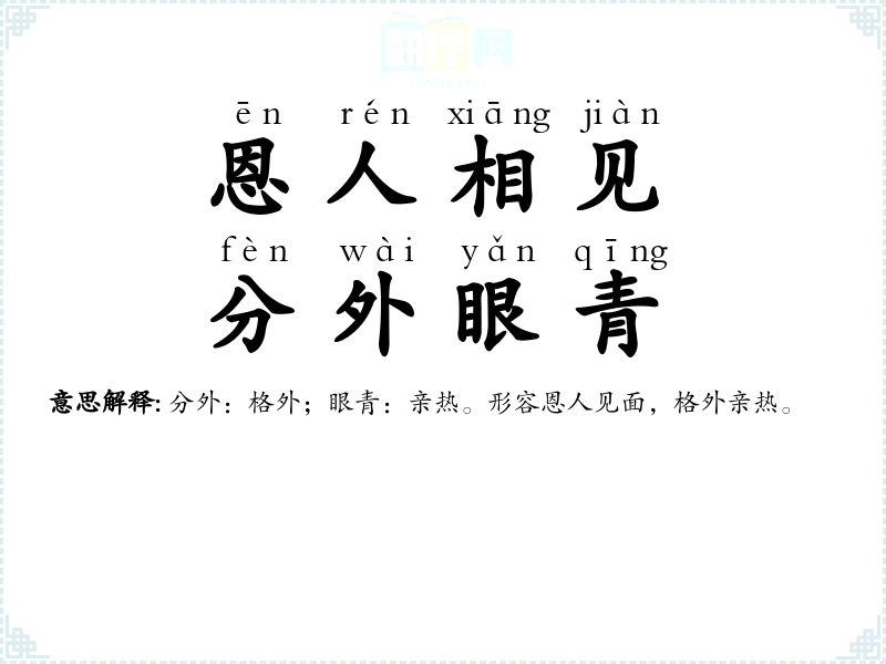 分外:格外;眼青:亲热。形容恩人见面,格外亲热。 |