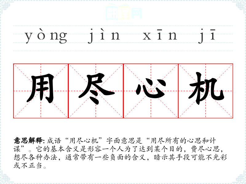 成语“用尽心机”字面意思是“用尽所有的心思和计谋”。它的基本含义是形容一个人为了达到某个目的,费尽心思,想尽各种办法,通常带有一些负面的含义,暗示其手段可能不光彩或不正当。