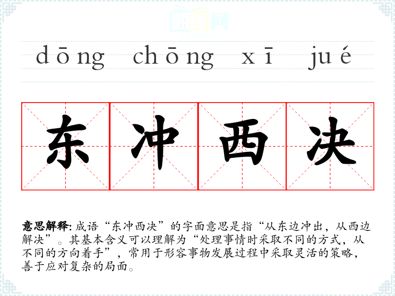 成语“东冲西决”的字面意思是指“从东边冲出,从西边解决”。其基本含义可以理解为“处理事情时采取不同的方式,从不同的方向着手”,常用于形容事物发展过程中采取灵活的策略,善于应对复杂的局面。