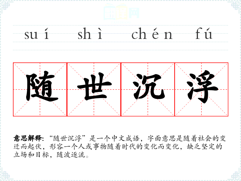 “随世沉浮”是一个中文成语,字面意思是随着社会的变迁而起伏,形容一个人或事物随着时代的变化而变化,缺乏坚定的立场和目标,随波逐流。