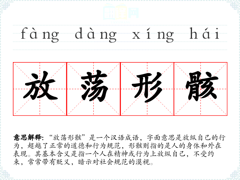 “放荡形骸”是一个汉语成语,字面意思是放纵自己的行为,超越了正常的道德和行为规范,形骸则指的是人的身体和外在表现。其基本含义是指一个人在精神或行为上放纵自己,不受约束,常常带有贬义,暗示对社会规范的漠视。