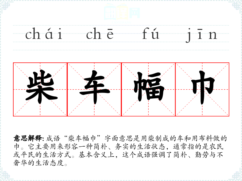 成语“柴车幅巾”字面意思是用柴制成的车和用布料做的巾。它主要用来形容一种简朴、务实的生活状态,通常指的是农民或平民的生活方式。基本含义上,这个成语强调了简朴、勤劳与不奢华的生活态度。