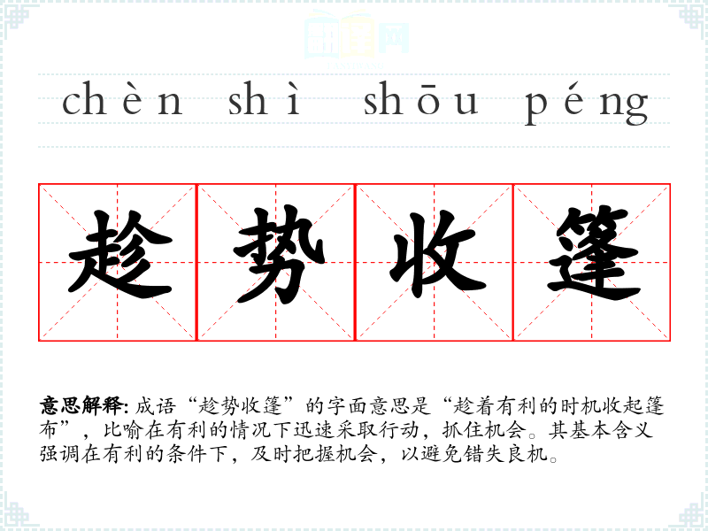 成语“趁势收篷”的字面意思是“趁着有利的时机收起篷布”,比喻在有利的情况下迅速采取行动,抓住机会。其基本含义强调在有利的条件下,及时把握机会,以避免错失良机。