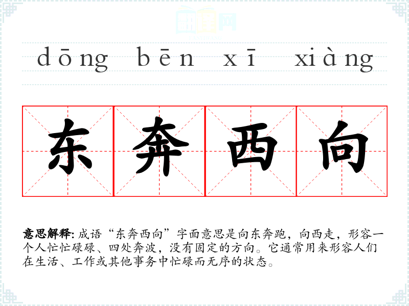 成语“东奔西向”字面意思是向东奔跑,向西走,形容一个人忙忙碌碌、四处奔波,没有固定的方向。它通常用来形容人们在生活、工作或其他事务中忙碌而无序的状态。