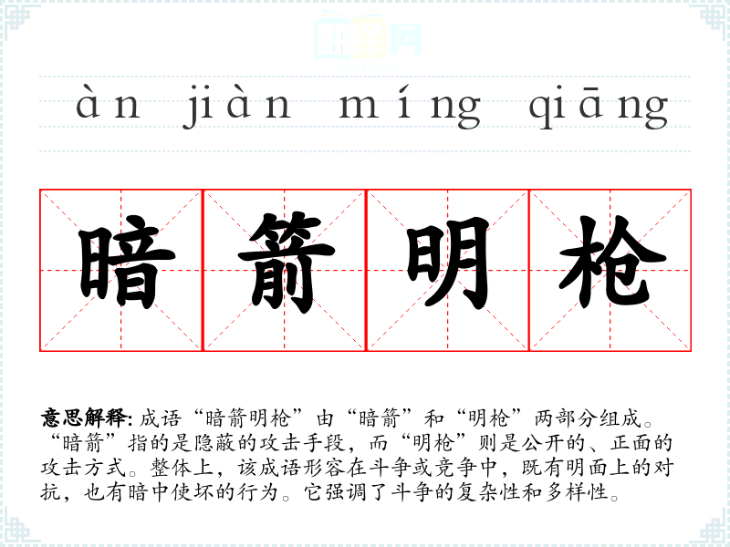 通过对“暗箭明枪”的学,我更加理解了在交流和竞争中保持警惕的重要性。这一成语在语言学上不仅丰富了我的表达,还让我意识到在生活中如何更好地应对复杂的人际关系。