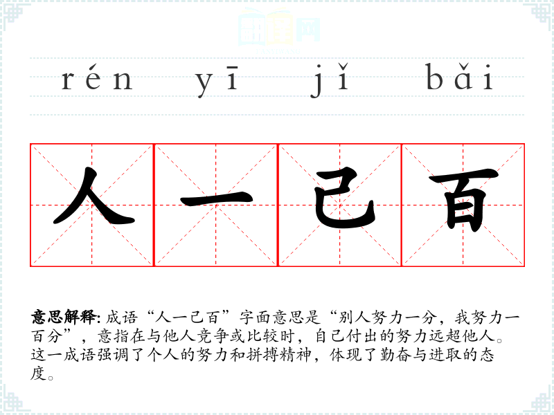 成语“人一己百”字面意思是“别人努力一分,我努力一百分”,意指在与他人竞争或比较时,自己付出的努力远超他人。这一成语强调了个人的努力和拼搏精神,体现了勤奋与进取的态度。