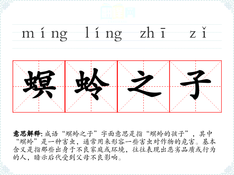 成语“螟蛉之子”字面意思是指“螟蛉的孩子”,其中“螟蛉”是一种害虫,通常用来形容一些害虫对作物的危害。基本含义是指那些出身于不良家庭或环境,往往表现出恶劣品质或行为的人,暗示后代受到父母不良影响。