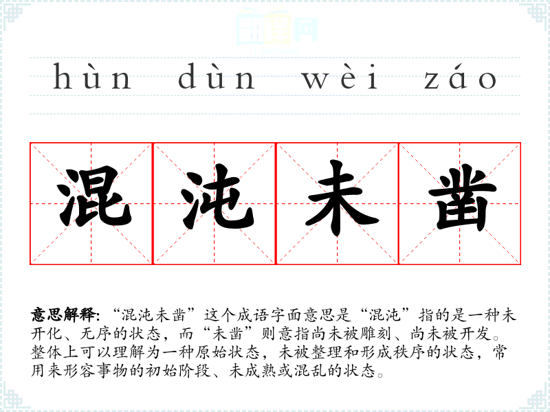 “混沌未凿”这个成语字面意思是“混沌”指的是一种未开化、无序的状态,而“未凿”则意指尚未被雕刻、尚未被开发。整体上可以理解为一种原始状态,未被整理和形成秩序的状态,常用来形容事物的初始阶段、未成熟或混乱的状态。