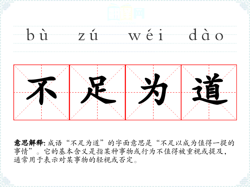 成语“不足为道”的字面意思是“不足以成为值得一提的事情”。它的基本含义是指某种事物或行为不值得被重视或提及,通常用于表示对某事物的轻视或否定。