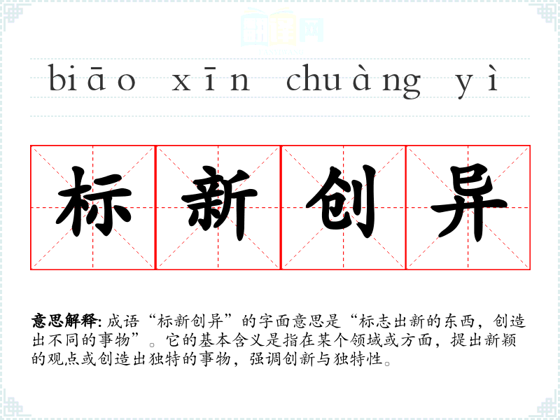 成语“标新创异”的字面意思是“标志出新的东西,创造出不同的事物”。它的基本含义是指在某个领域或方面,提出新颖的观点或创造出独特的事物,强调创新与独特性。