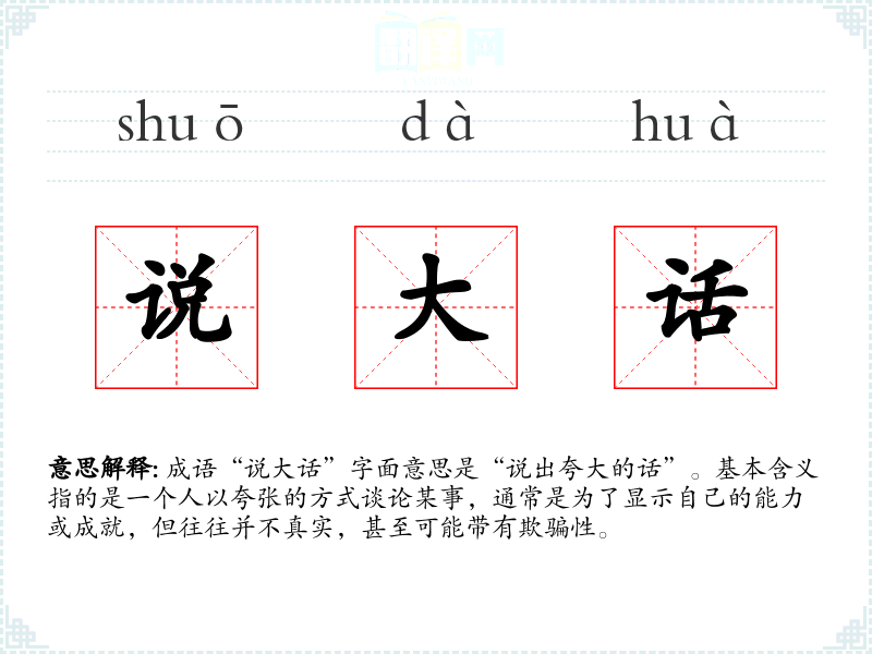 成语“说大话”字面意思是“说出夸大的话”。基本含义指的是一个人以夸张的方式谈论某事,通常是为了显示自己的能力或成就,但往往并不真实,甚至可能带有欺骗性。