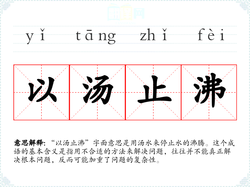 “以汤止沸”字面意思是用汤水来停止水的沸腾。这个成语的基本含义是指用不合适的方法来解决问题,往往并不能真正解决根本问题,反而可能加重了问题的复杂性。
