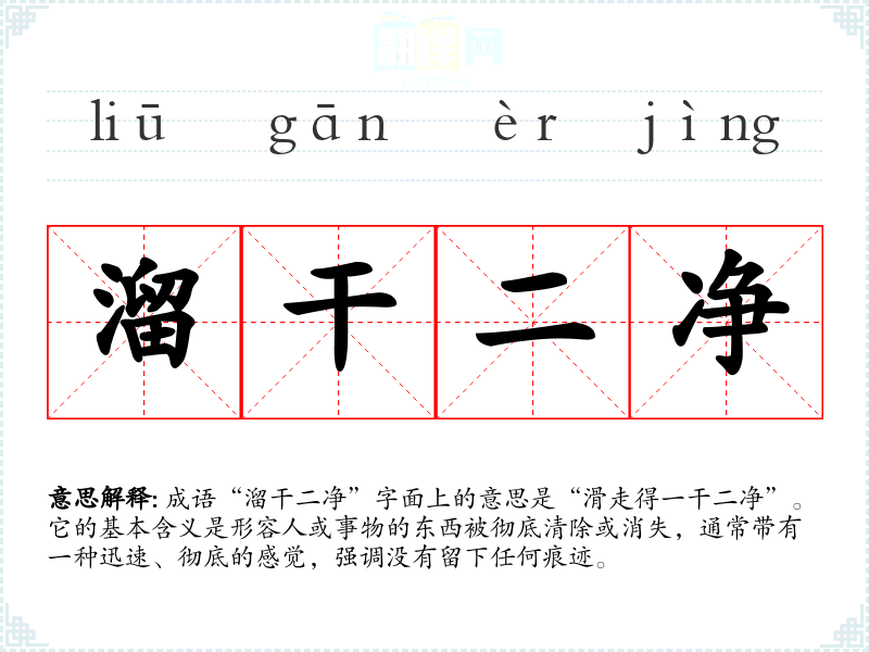 成语“溜干二净”字面上的意思是“滑走得一干二净”。它的基本含义是形容人或事物的东西被彻底清除或消失,通常带有一种迅速、彻底的感觉,强调没有留下任何痕迹。