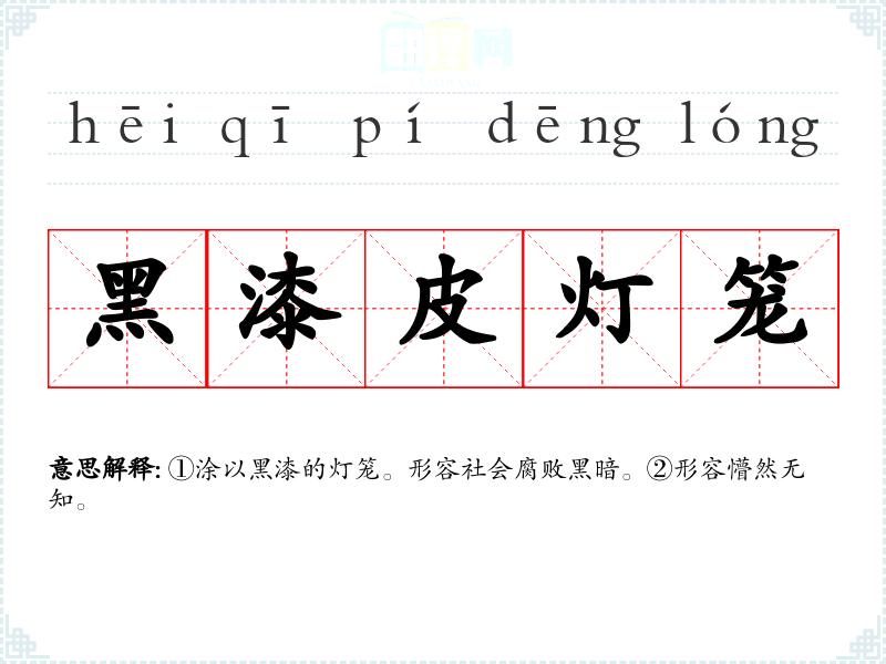 ①涂以黑漆的灯笼。形容社会腐败黑暗。②形容懵然无知。 |