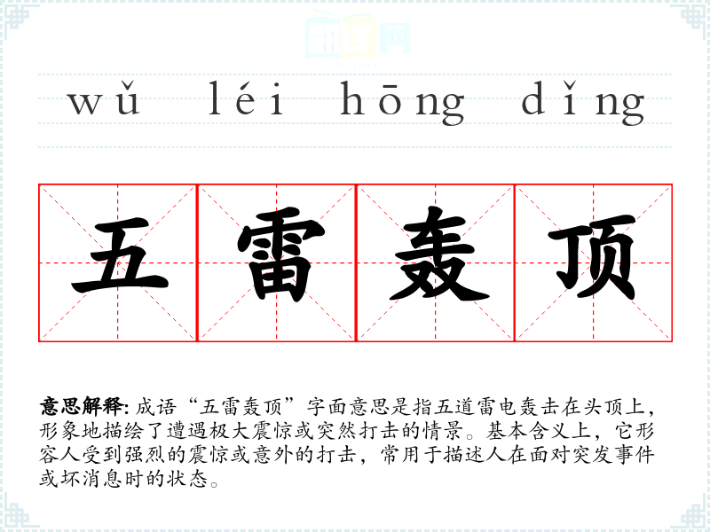 成语“五雷轰顶”字面意思是指五道雷电轰击在头顶上,形象地描绘了遭遇极大震惊或突然打击的情景。基本含义上,它形容人受到强烈的震惊或意外的打击,常用于描述人在面对突发**或坏消息时的状态。