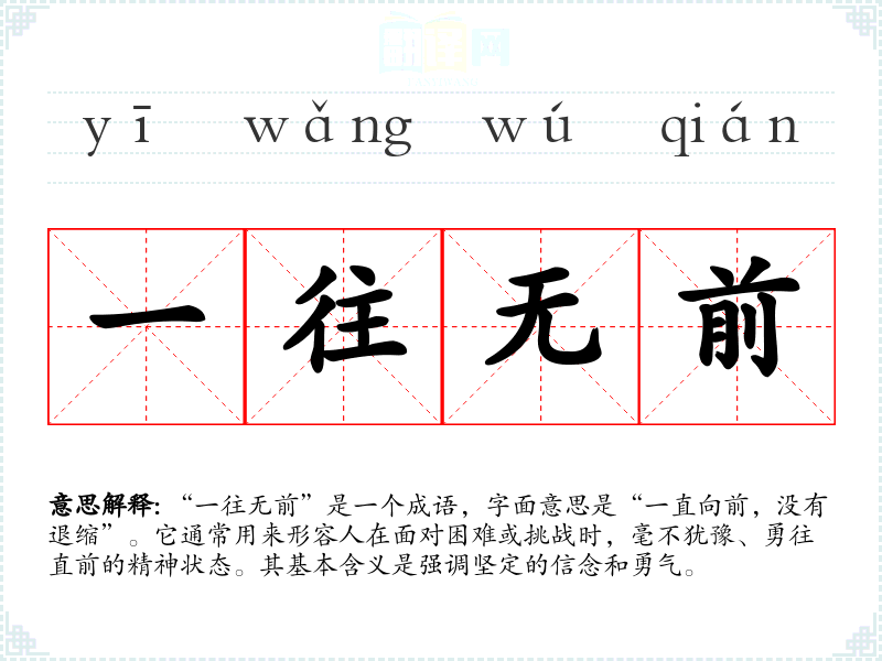“一往无前”是一个成语,字面意思是“一直向前,没有退缩”。它通常用来形容人在面对困难或挑战时,毫不犹豫、勇往直前的精神状态。其基本含义是强调坚定的信念和勇气。